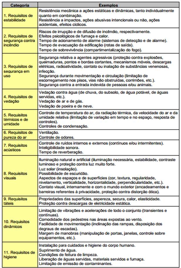 Um importante documento que fortaleceu na definição didática do termo desempenho em construções por todo mundo foi a elaboração da ISO 6241, em 1984, que serviu de suporte inclusive para a implantação de norma em países signatários da ISO. Tal documento estabeleceu um conjunto de requisitos funcionais que necessariamente devem ser observados por usuários de imóveis.