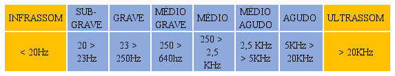 Por uma questão prática de classificação segundo Valle (2009), em seu Manual Prático de Acústica, as faixas de frequência são catalogadas da seguinte forma: