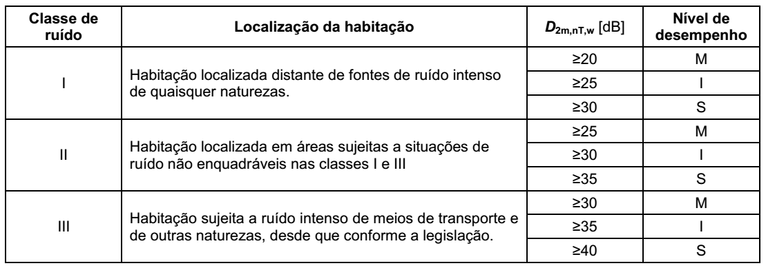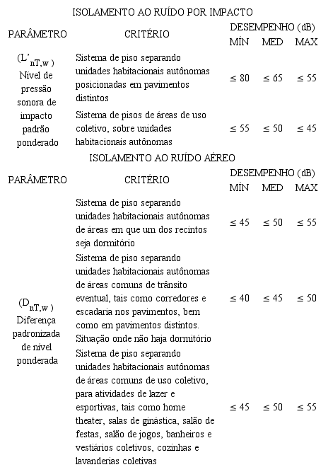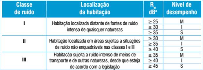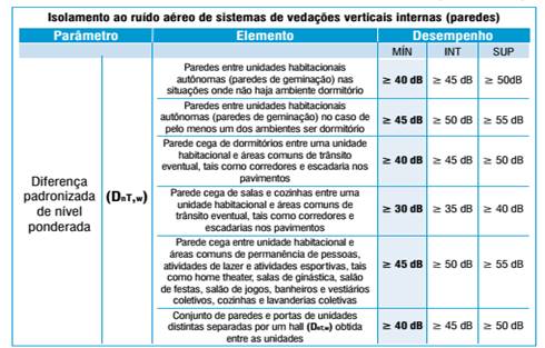 Por sua vez a NBR 15.575/2013 estabelece os limites mínimos de isolamento acústicos para ambas as situações.