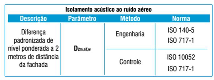 O método de engenharia utiliza para avaliação do parâmetro de diferenciação padronizada de nível pondera (DnT,w) as ISOs 140-4 e 717-1. Já pelo método de controle, para mesma avaliação utiliza as ISOs 10052 e 717-1. O procedimento para medição na ISO 140-4 e na ISO 10052 baseia-se na emissão de um ruído um compartimento da edificação, através de uma fonte sonora omnidirecional, e através da medição da pressão sonora em pacotes de frequência no recinto emissor e no compartimento receptor traçam a diferença de nível padronizada (DnT).