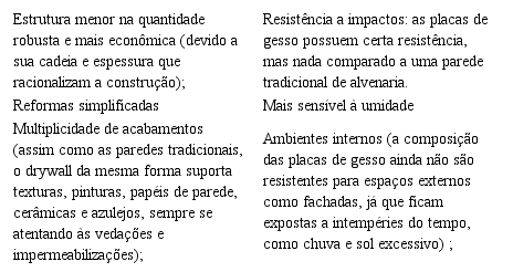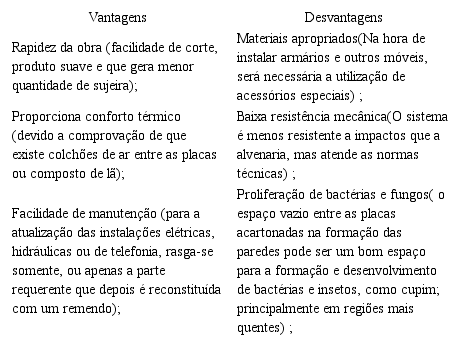 Destaca-se no Quadro I algumas vantagens e desvantagens do uso do gesso acartonado.