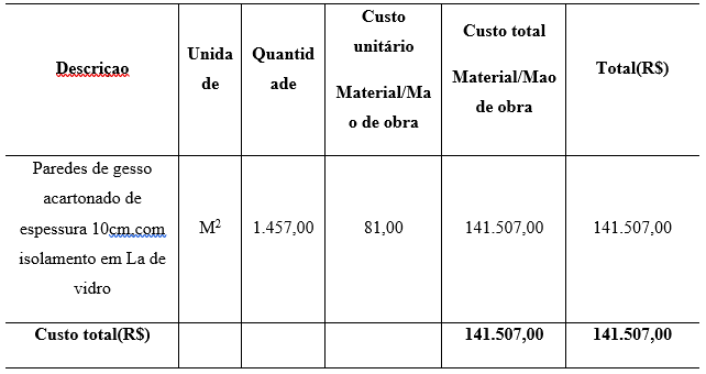 Como um exemplo, segue abaixo uma tabela comparativa dos gastos de uma obra se for feita de Drywall e se for feita de tijolos cerâmicos (alvenaria):