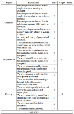 Furthermore, Ur (1996) stated that speaking is one of the most important skills of all the four language skills because individuals who learn a language are referred to as the speakers of that language. Therefore, Davies & Pearse (2000) explain that the main purpose of English language teaching is to give learners the ability to use English language effectively and correctly in communication. In this study speaking skills are studied only in three categories: grammar, fluency and comprehension. The scoring rubric from Brown (2004) is used.