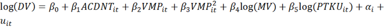 Tendo em vista esses fatores e avaliando empiricamente quais outros da amostra podem afetar/explicar o desempenho dos vagões (DV), inicialmente, determina-se as seguintes variáveis independentes (ou explicativas): índice de acidentes (ACDNT), velocidade média de percurso (VMP), manutenção em vagões (MV) e produção (volume de carga em TKU) por vagão (PTKUV). A unidade de medida da produção foi escolhida a partir da literatura, onde verificou-se que estudos como os de Fernandes (2011) e FitzRoy e Smith (1995) mensuraram o volume de carga em tonelada por quilômetro útil (TKU), em vez de somente tonelada útil (TU). Isso também elimina a necessidade de mais uma variável para captar o efeito da distância percorrida isoladamente.