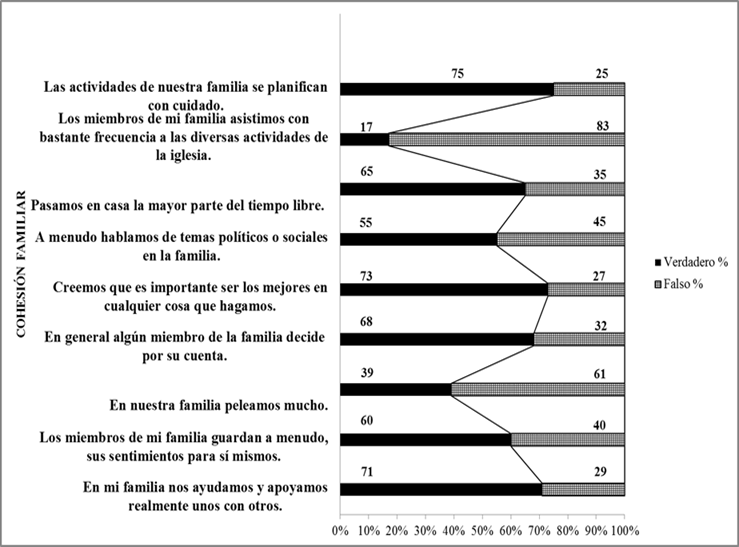 Los resultados (ver gráfico 1) evidenciaron que el 71% de los miembros de las familias se apoyan mutuamente, planifican con cuidado sus actividades (75%), pasan en casa la mayor parte del tiempo libre (65%), pelean poco entre sí (39%) y se manifiestan independientes al guardarse sentimientos para sí mismos (60%), y decidir por su cuenta (68%). La exploración de los indicadores señalados permite identificar a la cohesión como un elemento importante para los grupos familiares de los niños encuestados. Vargas (2009), señala que las relaciones familiares promueven la interacción entre los sujetos.