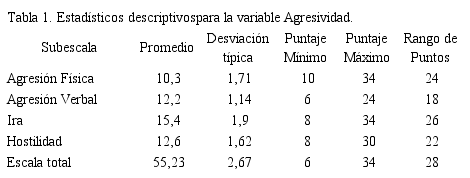 Los resultados estadísticos de la variable agresividad se presentan en la tabla 1. Los valores calculados indican la presencia de esta variable en los niños encuestados. Es importante señalar esto porque la agresividad es un precedente de la violencia y por tanto resulta necesario diagnosticar su presencia antes de que escale a otros niveles.
