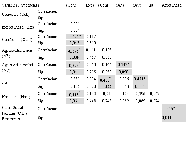La presencia de la ira registró una correlación positiva significativa con conflictos (p: 0,022), al igual que con agresión verbal (p: 0,036). Esta última está correlacionada significativamente con agresión física (0,05). Los puntajes totales de la dimensión Relaciones del Clima Social Familiar se correlaciona de forma negativa con la variable agresividad (p: 0,044), lo cual indica que a medida que se incrementan las relaciones en la organización familiar, disminuyen los niveles de agresividad.