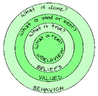 Kwast’ (1992) model posits that underneath any action of humans within a culture is a subsequent set of values (What is good or best?), beliefs (What is true?), and worldviews (What is real?). These intangible cultural elements serve as the underlying foundations upon which any human actions and behaviors are founded. That is, human behavior does not occur in isolation of these invisible structures. Goodenough (2003) and Kwast (1992) provided the theoretical and practical directions on understanding the core of an fascinating cultural phenomenon, the counter-culture, and how it figures in the lives of people as they navigate the re-shaping and re-construction of institutions and activities that enable them and the society to live in that very same social system. The behavior under question in this paper are the young teachers’ decisions to