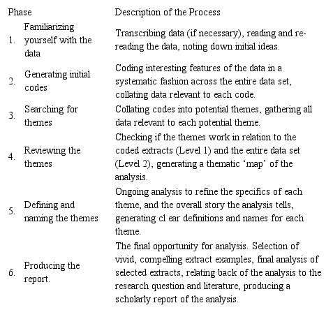Braun and Clarke’s (2006, p. 87) thematic analysis protocol was used as a data analysis strategy to facilitate the distillation and elucidation of the meaning units and their respective components from the data set. This particular data analysis strategy is flexible to use for several epistemological traditions and approaches in qualitative research (Willig, 2013). After their video files were transcribed it was subjected to a theoretical coding scheme based on Kwast’s (1992) framework. Table 1 below presents the phases of Braun and Clarke’s (2006) analysis protocol which was used to explore the main underlying cultural themes underneath the decisions and experiences of the four young teachers in teaching in disadvantaged schools.
