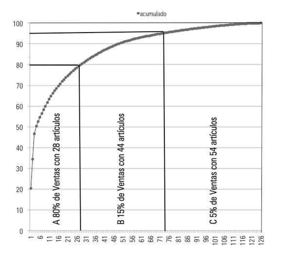 En el Gráfico del Método ABC de Pareto (Figura 4) se puede visualizar la composición de la distribución de los artículos en la empresa, mostrando de manera detallada la categoría A como la más importante, porque representa el 80% de las ventas, compuesta por 28 artículos. Posteriormente se encuentra la categoría B, el 80% de las ventas, y se compone por 44 artículos; luego la categoría C, la cual representa el 5% de las ventas y compuesta por 54 artículos. Situación que permite observar que los artículos vendidos en las categorías B y C son complementos de los de la categoría A.