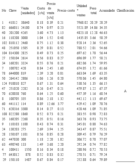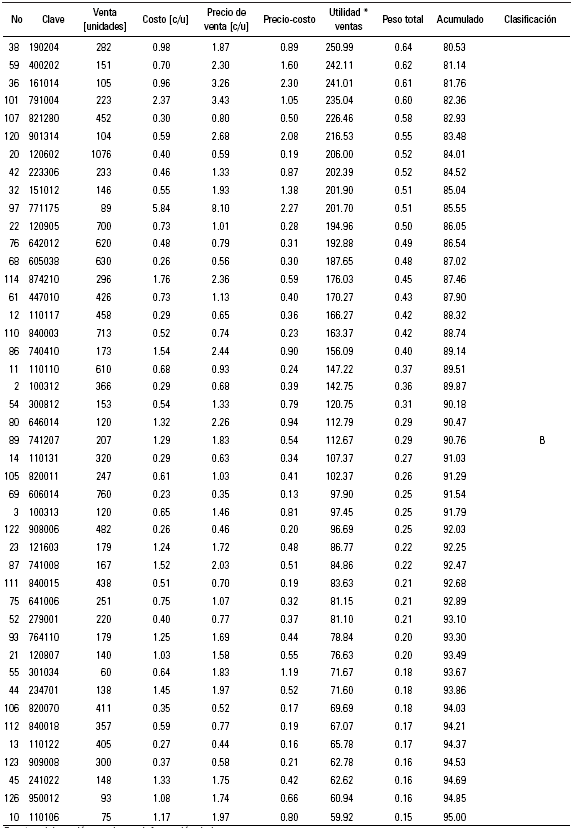 En la clasificación A inicia el ordenamiento considerando 28 productos, casi el 80% de la utilización, y se muestra que tiene un 79.89% de utilidad. Los artículos agregados en dicha categoría son el 1, 82, 40, 16, 102, 48, 104, 27, 34, 7, 78, 50, 124, 47, 70, 8, 60, 71, 108, 35, 9, 24, 28, 62, 63, 4, 77 y 29. Entre estos ítems se tienen algunos productos que presentan mayor peso, con 20.29 en el artículo número uno, de gran utilidad. El artículo 82 también cuenta con gran peso, siendo 14.06 y su utilidad es muy grande. Al igual que el artículo 40 en el cual su peso es de 12.28 y es el tercero de más utilidad. Los anteriores artículos son los que de forma individual dejan mayores utilidades a la empresa. Los artículos en mención se consideran como los más representativos para la empresa, porque su participación en las ventas es grande y le dejan mayores utilidades al relacionarlos con sus ventas. Por lo cual, se debe analizar su posicionamiento en el almacén y su reabastecimiento oportuno.