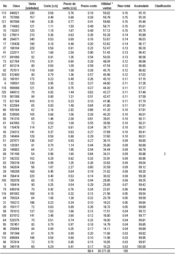 En la clasificación C inicia el ordenamiento considerando 54 productos, el 5% de la utilización, y se muestra un 100% del total, sumadas la clasificación A y B, los artículos agregados en dicha categoría son el 113, 91, 121, 85, 15, 53, 49, 17, 37, 41, 117, 73, 67, 92, 103, 33, 6, 118, 125, 119, 72, 74, 66, 65, 90, 81, 18, 43, 25, 51, 19, 26, 88, 57, 83, 58, 39, 94, 100, 5, 79, 116, 84, 31, 30, 98, 109, 64, 95, 46, 99, 115, 96 y 56. Los artículos con mayor utilidad son el 113, de 0.15 de peso. El artículo 91, con peso de 0.15, al igual que los artículos 121, 85, 15, los cuales al sumarse con los artículos 53, 49, 17, 37 y 41, tienen utilidades mayores a $51 USD, siendo los productos más representativos de esta clasificación. Los anteriores artículos son los que de forma individual dejan mayores utilidades en la clasificación C a la empresa. Los artículos en mención se consideran muy necesarios, porque son complementarios para otras ventas y es importante conservarlos en el inventario y posicionarlos en lugares poco concurridos debido a sus ventas menores.