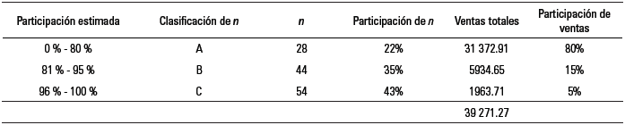 Al realizar el análisis ABC en la Tabla 4 se presenta que la clasificación A, con menos artículos tiene mayor participación en las ventas estimándose de 0% a 80 % con 28 artículos, un 22% del total de artículos vendidos por la empresa y un monto de $31,372.91 USD en ventas totales; seguida de la clasificación B, compuesta por un número intermedio de artículos y una participación en las ventas estimada de 35% con 44 artículos, el 15% del total de artículos vendidos y un monto de $5934.65 USD en ventas totales. Finalmente, se encuentra la clasificación C compuesta por un número pequeño de artículos y una participación baja en las ventas representando el 43%, con 54 artículos correspondientes a un 5% del total de artículos vendidos y un monto de $1963.71 USD en ventas totales.