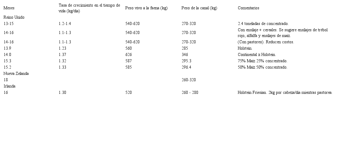 Respecto a los costos obtenidos en Irlanda: En estabulación el costo de alimento es de 546 US$ (14.5 meses) peso carcasa 377(kg), 675 US$ (16 meses) peso carcasa 405 (kg) y 835 US$ (17.5 meses) peso carcasa 457 (kg), (Crosson, 2015). En pradera el costo de alimento entregado fue de 148 US$ (18 meses) peso carcasa 368 (kg), 289 US$ (19 meses) peso carcasa 415(kg) y 450 US$ (20 meses) peso carcasa 447 (kg), (Crosson, 2015).