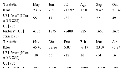 Como se observa en la Tabla 4, las ganancias de peso del modelo analizado de recría-engorda se deja de percibir dinero por causa de las pérdidas de peso que el animal está obteniendo en esos meses críticos, generando pérdida de peso en el animal. En el mes de julio se deja de percibir 32 US$ por animal, lo cual si se valora a los 75 toritos (cantidad base del estudio), se obtiene que en el mes de julio, por ejemplo, se están perdiendo 2400 US$, y si se continua con la recría-engorda se presentan nuevamente dos meses críticos (feb.-abr.), lo cual es cercano a la finalización de la recría-engorda, y demuestra no ser sostenible financiera ni productivamente para ningún productor. Por lo tanto, es conveniente para el productor vender el animal como ternero en los primeros dos meses de la recría-engorda, que finalizar el animal.