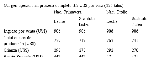 Al analizar lo realizado en Chile, el margen operacional en la Tabla 5 se observa que no sobrepasa los 295 US$ de ganancia por animal, utilizando principalmente como base de alimentación la pradera, con peso vivo de 470kg., a los 18 meses; y los costos operacionales se encuentran entre los 763 US$ y 717 US$.