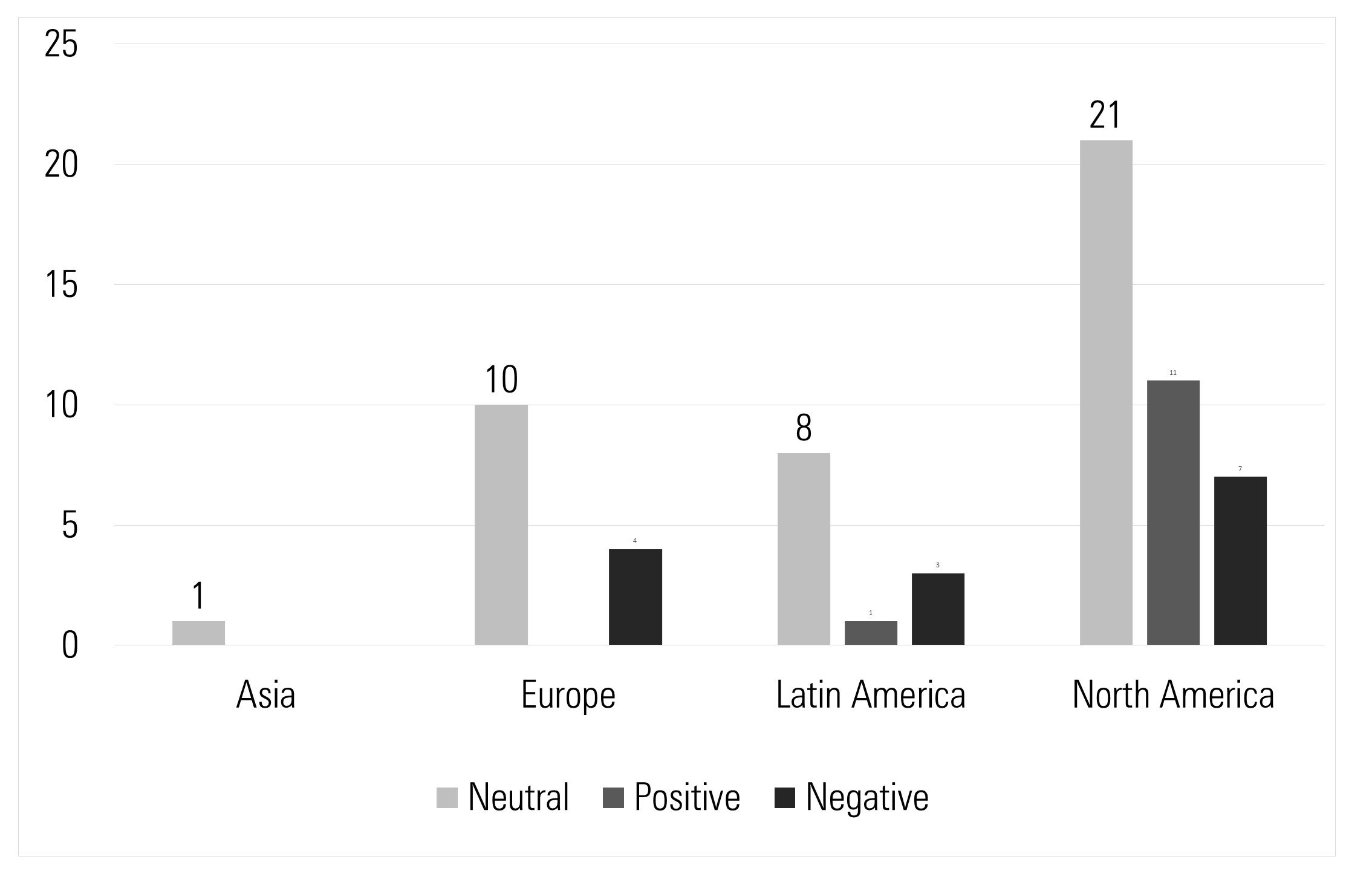 Finally, Figure 1 shows how IDs outcomes for firms were studied per region. The study found that North American region shows the higher number of IDs research oriented to positive outcomes, contrary to Latin America region where negative outcomes are higher than positive ones. Europe shyly appears just with negative outcomes studies and no one positive. Asia region needs further research on IDs, because it presents just one neutral paper.