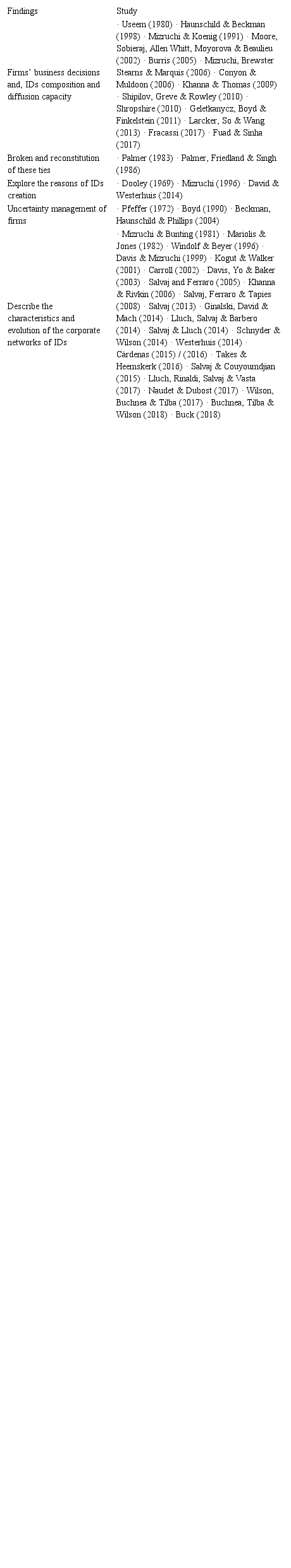 Results of this review show that there is a 59% of the IDs studies pointing out non-positive, neither negative, but neutral practices/findings regarding IDs activity (See Table 1). Findings of these studies are different, such as: (i) Firms’ business decisions and IDs composition and diffusion capacity; (ii) broken and reconstitution of these corporate ties; (iii) Explore the reasons of IDs creation; (iv) Uncertain management of firms, and (v) Describe the characteristics and evolution of the corporate networks of IDs.