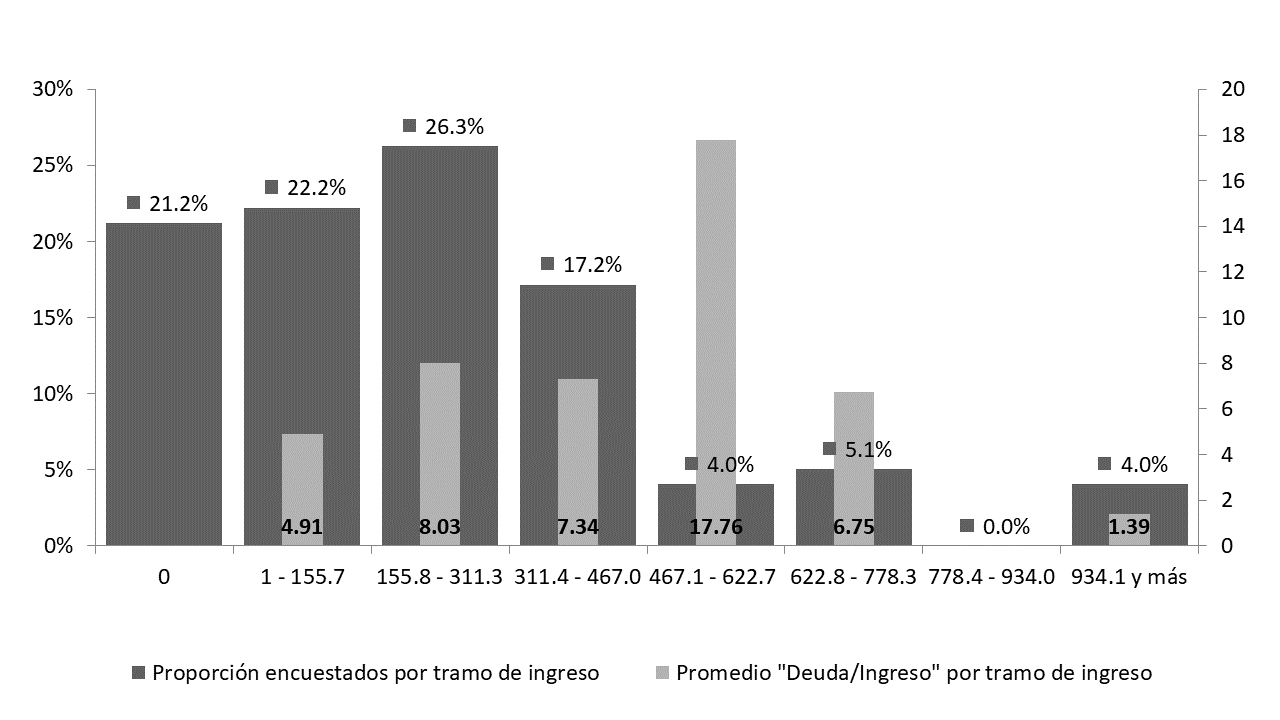 El endeudamiento promedio, calculado sobre los individuos que señalaron percibir ingresos (78.8%), fue 7.07 veces el ingreso mensual. Por otra parte, el endeudamiento promedio de las personas que señalaron percibir ingresos, tener deudas y conocer su monto (46.5% de los encuestados), fue 12 veces el ingreso mensual. Cabe señalar que el 65.7% de los consultados recibía un ingreso menor o igual a USD$467 al mes, cifra que se aproxima al salario o ingreso mínimo mensual del país (USD$420.3 a contar del 1 de Julio de 2017).