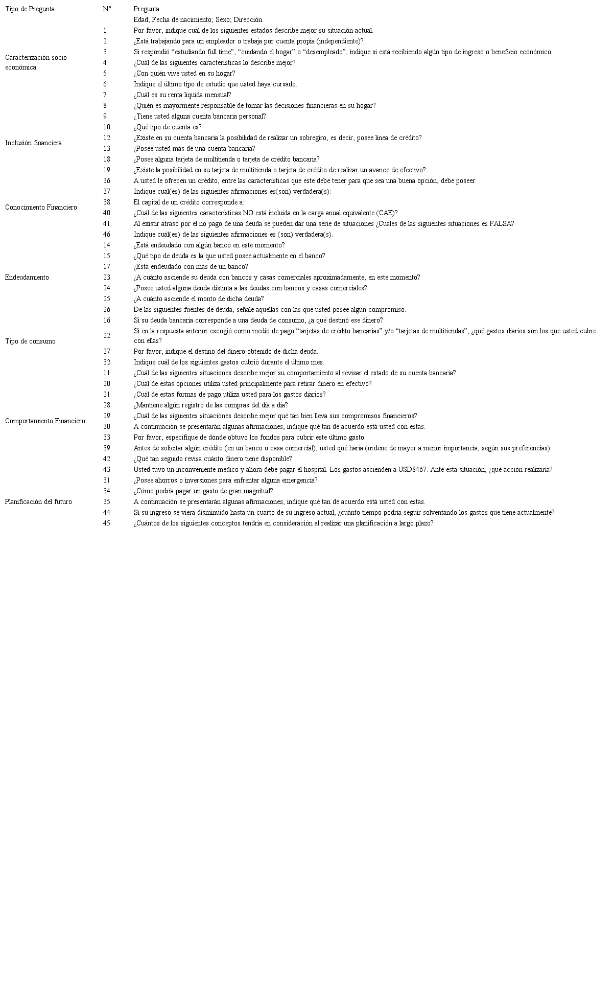 El cuestionario final quedó compuesto por 46 preguntas y cuatro secciones: (1) antecedentes personales; (2) administración del dinero; (3) planificación del futuro y (4) diagnóstico en educación financiera. La Tabla 1 muestra la reclasificación de las preguntas del cuestionario. El instrumento fue validado por medio de una prueba piloto ¾entre los días seis y 10 de Octubre¾ a seis personas de ambos sexos.