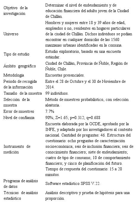 Este estudio analizó cuál era el nivel de endeudamiento y de educación financiera del adulto joven de la ciudad de Chillán. Para ello se utilizó un método de muestreo probabilístico con selección aleatoria, y se aplicó un cuestionario de 46 preguntas a una muestra de 99 individuos.