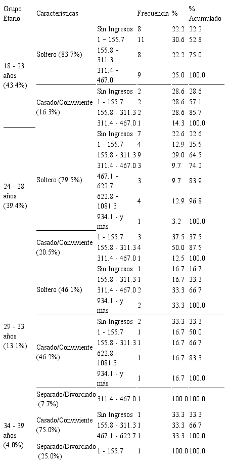 El 60.6% de los encuestados fue de sexo femenino y el 39.4% de sexo masculino. La Tabla 3 muestra las características de la muestra por grupo etario, estado civil y tramo de ingreso mensual. La mayor proporción de los encuestados (43.4%) se ubicó en el grupo etario de 18 a 23 años. En este grupo, el 83.7% estaba soltero, y sus ingresos no superaban los USD$467 al mes. La segunda mayor proporción tenía entre 24 y 28 años, donde el 79.5% estaba soltero, y el 64.5% percibía un ingreso mensual inferior a USD$311. Más de la mitad tenía menos de 30 años.