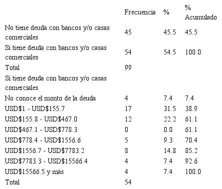 El 45.5% declaró no tener deudas con bancos y/o casas comerciales, pero el 54.5% señaló sí tenerlas. Con respecto a la proporción de adultos jóvenes que tenía deudas: el 31.5% debía USD$156 o menos y el 22.2% reportó una deuda entre USD$156 y USD$467, tal como muestra la Tabla 4. El 7.4% de los encuestados desconocía el monto de su deuda.