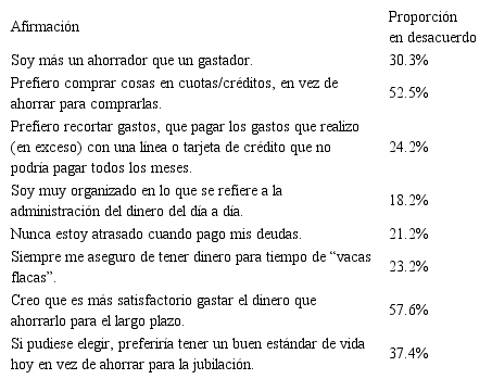 La Tabla 5 muestra la proporción de encuestados que expresó algún grado de desacuerdo (“algo en desacuerdo”, “en desacuerdo”, o “muy en desacuerdo”) con las afirmaciones allí planteadas. El 30.3% se consideró más gastador que ahorrador; el 47.5% prefería comprar a crédito, en vez de ahorrar para comprar; el 24.2% no estaba de acuerdo con reducir gastos para evitar el uso de una línea o tarjeta de crédito que, posteriormente, no podría pagar; el 18.2% se consideró no muy organizado en lo que se refiere a la administración del dinero; el 21.2% reconoció tener algún grado de retraso en el pago de las deudas; el 23.2% no siempre reservaba dinero para tiempos de “vacas flacas”; el 42.4% creía más satisfactorio gastar el dinero que ahorrarlo para el largo plazo; y el 62.6% prefería tener un buen estándar de vida hoy, que ahorrar para la jubilación.