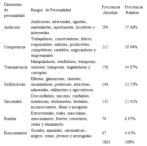 Los resultados conseguidos de los cuestionarios semiestructurados han sido agrupados en aspectos de similitud, significado y coherencia de los 1063 rasgos obtenidos. Este procedimiento de agrupación considera tanto aspectos positivos como negativos, evaluando sinónimos y antónimos. Por ejemplo la dimensión sinceridad considera rasgos como honestos, mentirosos, transparentes, falsos o inconsecuentes (Tabla 1). No obstante a lo anterior, la literatura sugiere que los rasgos que sean incluidos en la escala de personalidad de marca, deben ser presentados de carácter positivo, tal como ha sido realizado en la Figura 2.