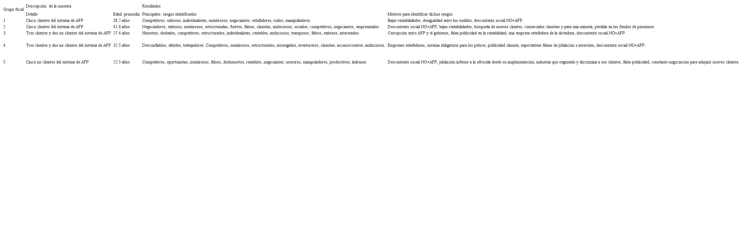 La Tabla 1 está conformada por cuatro columnas, destacando la dimensión de personalidad de marca con sus respectivos rasgos, como también su frecuencia absoluta y relativa obtenida de los cuestionarios semiestructurados. A su vez, el uso de grupos focales (Tabla 2), contribuye a la interpretación de los rasgos de personalidad, señalando los motivos, circunstancias y acontecimientos que condicionan e interpretan tanto a los clientes actuales como a los futuros del sistema de pensiones de AFP. Con estas herramientas se evidencia la presencia de siete dimensiones de personalidad; ambición, competencia, transparencia, sofisticación, rudeza, sinceridad y emocionalidad.