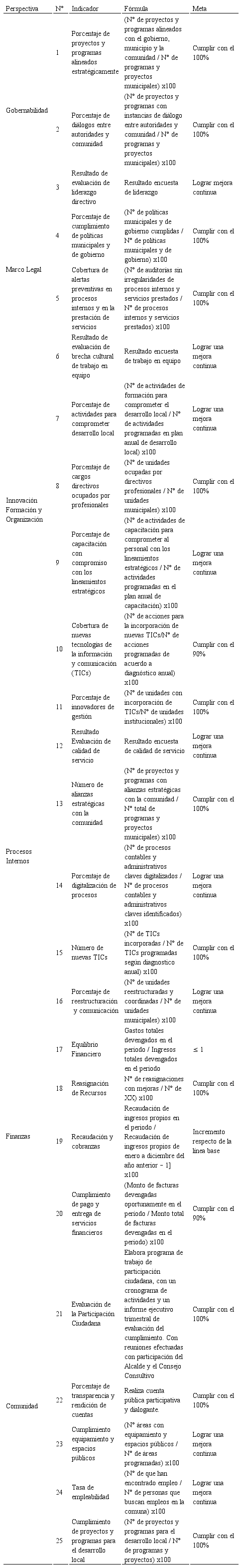 La Tabla 4 describe de acuerdo con cada perspectiva, los indicadores, la fórmula y la meta.