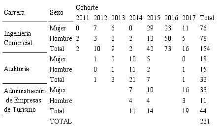 La población estudiada abarcó a todos los estudiantes matriculados en alguna de las carreras de la Facultad de Ciencias Económicas y Administrativas de la Universidad Austral de Chile, el año 2017. En Ingeniería Comercial se matricularon 557 alumnos, en Auditoría fueron 221 y en Administración de Empresas de Turismo 175. La cantidad total de alumnos matriculados el año 2017 fue de 953 estudiantes.