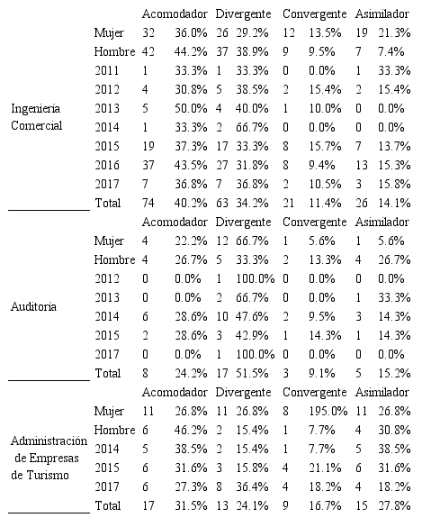 Respecto de los Estilos de Aprendizaje fue posible detectar que, tanto en Ingeniería Comercial como en Administración de Empresas de Turismo, el estilo Acomodador es el más frecuente en los estudiantes, no así en Auditoría, donde la gran mayoría de los encuestados se identifica más con el estilo Divergente.