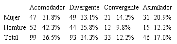 El método de aprendizaje de una persona no se ajustará estrictamente a una de cuatro modalidades básicas de aprendizaje ya descritas, lo más probable es que se dé una combinación de estas y el producto serán las capacidades: convergente, divergente, asimilador y acomodador (Muñoz-Seca y Sánchez, 2001). Por lo tanto, se espera que los resultados de los estudiantes de la Facultad estudiada se ubiquen dentro de estas opciones:
