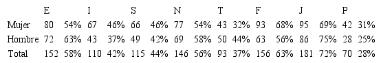 La distribución de las preferencias psicológicas de la Facultad se ilustra en la Tabla 5. En la muestra, el porcentaje de estudiantes de la Facultad de Ciencias Económicas y Administrativas de la Universidad Austral de Chile tiene mayor preferencia por Extraversión que por I, tanto en hombres como mujeres. En cuanto a la percepción de la información, los estudiantes se inclinan más por la función Intuición que la S. Respecto al discernimiento (T-F) y la actitud frente a la vida (J-P), la mayoría prefiere F y J respectivamente.