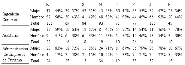 En todas las carreras la E es la preferencia psicológica predominante en el género masculino, mientras que el género femenino tiende a la I (Tabla 5). El porcentaje de hombres que percibe la información con la función N es mayor que el de las mujeres, quienes prefieren S. Con relación a la forma de decidir, los hombres que estudian en la Facultad tienden a la T, en cambio la preferencia de las mujeres es F. Respecto de la actitud frente a la vida, las alumnas de Ingeniería Comercial como de Auditoría se inclinan por la P, en cambio la preferencia del género masculino de dichas carreras es el J. Se observa en el caso de los estudiantes de Administración de Empresas de Turismo, que las mujeres tienen mayor tendencia a J y los hombres a P; en este último resultado puede influir el hecho de que hubo una mayor participación en el estudio de mujeres que de hombres de la carrera Administración de Empresas de Turismo.