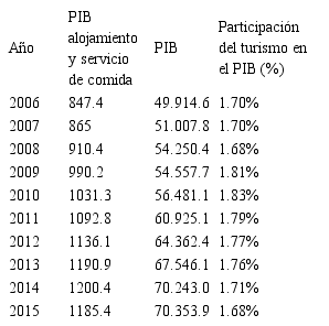 El turismo tiene una amplia gama de actividades, productos y servicios que se desarrollan prácticamente en todos los sectores de la economía: hoteles y restaurantes, construcción, transporte, etc. Las estadísticas de la participación de la actividad turística en la economía, se realiza sobre la base de datos de la rama alojamiento, restaurante y servicio de comida del PIB presentados por el BCE. Se denota que su participación en el PIB se encuentra en alrededor del 2%. (Ver Tabla 1)