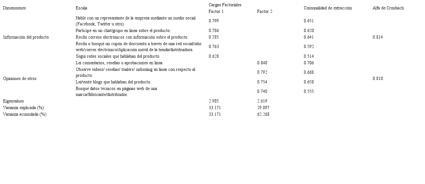 En primer lugar, se han evaluado los 16 factores de la escala para identificar el momento ZMOT, mediante un análisis factorial exploratorio, se redujo de 16 a 9 ítems la escala propuesta por Google, los cuales fueron agrupados en dos factores para explicar el modelo ZMOT. El test de esfericidad de Barlett señala valores satisfactorios (p<0.000, chi-cuadrado=1705.6, gl=36). En el caso de índice Kaiser-Meyer-Olkin (KMO), existe una medida de 0.84. Con los resultados de estos indicadores se observa correlación entre los ítems evaluados, lo que permite la aplicación de un análisis factorial exploratorio. En este estudio se ha realizado un análisis de componentes principales con una rotación varimax con criterios de eigenvalues mayores a 1. Los valores absolutos de las cargas factoriales deben ser mayores a 0.5, por lo que se han eliminado siete ítems al no cumplir con este criterio. Además esta escala explica un 62.63% de la varianza total acumulada. Luego de este análisis ha sido posible determinar dos factores que reflejan elementos para realizar una compra, la información del producto y la opinión de otros, ambos obteniendo consistencia en sus alfas de Cronbach, 0.81 y 0.81 respectivamente.