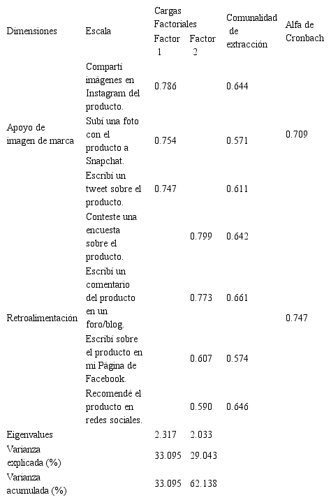 El número de factores definidos debe explicar a lo menos el 60% de la varianza explicada para ser considerada como un modelo adecuado (Malhotra, 2008). Ha sido utilizado un método de extracción de componentes principales, donde se incluyeron sólo aquellos factores cuyos coeficientes de eigenvalue son mayores a 1.0 (Cabrera, Castañeda, De Vries, y Navarro, 2010). En relación a las cargas factoriales se espera un valor mayor a 0.4 que corresponde al valor mínimo exigido (Hair, y cols., 2009).