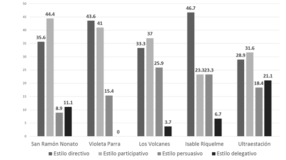 El estilo de liderazgo predominante del director del centro de salud San Ramón Nonato percibido por los funcionarios es el participativo, con un 44,4%; el estilo que menos predomina según la percepción de los funcionarios es el persuasivo (8,9%). Por su parte, los resultados del centro de salud Violeta Parra muestran que el estilo predominante es el directivo con un 43,6%, siendo el estilo delegativo el menos predominante (0%). Para el centro de salud Los Volcanes, los resultados muestran que el estilo predominante es el participativo con un 37%, y el menos predominante el delegativo (3,7%). El centro de salud Isabel Riquelme el 46,7% de los funcionarios percibe que el estilo de su director es el Directivo, y el menos predominante es el delegativo (6,7%). Finalmente, en el centro de salud Ultraestación el estilo participativo es el que predomina con un 31,6% y el persuasivo con un 18,4% pasa a ser el menos predominante (Figura 2).