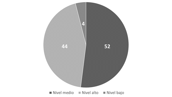 La figura 3 muestra que en términos de resultados de satisfacción laboral se obtiene que un 52% de la muestra posee un nivel “Medio”, mientras que un 44% plantea un nivel “Alto” de satisfacción laboral. Solo un 4% manifiesta un nivel “Bajo”.