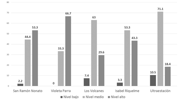 El nivel de satisfacción laboral percibida por los funcionarios de los distintos centros de atención primaria en salud son los siguientes: en el centro San Ramón Nonato se muestra que el 53% de los funcionarios perciben un alto nivel de satisfacción laboral, en tanto que el 2,2% percibe un bajo nivel de satisfacción. El 66,7% de los funcionarios del centro de salud Violeta Parra percibe una alta satisfacción laboral (mayor “nivel alto” de los cinco centros), no exhibiéndose niveles bajos de la misma. En tanto que en el centro de salud Los Volcanes el nivel medio se observa en el 63% de sus funcionarios y el nivel bajo en un 7,4%. La situación observada en el centro de salud Isabel Riquelme muestra que el 53,3% de sus funcionarios poseen un nivel de satisfacción medio y el 3,3% un nivel bajo. Por último, en el centro de salud Ultraestación el nivel medio obtiene un 71,1% y el nivel bajo se da en un 10,5% de sus funcionarios, siendo el mayor porcentaje de nivel bajo de los cinco consultorios en estudio (Figura 4).