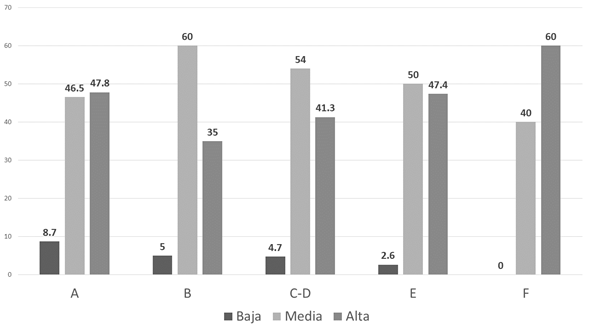 Si se realiza el análisis global de cada categoría en la muestra total se puede observar que en la categoría A el 47,8% de los encuestados presenta un nivel de satisfacción laboral alto, un 8,7% de ellos refiere un nivel bajo. En relación a la categoría B se evidencia que el 60% posee un nivel medio de satisfacción laboral, un 54% de la categoría C-D y un 50% de la categoría E se encuentran en la misma condición. Un dato que llama la atención es que el 60% de la muestra de la categoría F refiere un nivel alto de satisfacción laboral. En general en cada categoría, la distribución mayoritariamente se divide entre los niveles medios y altos (Figura 5).