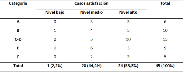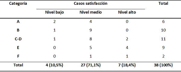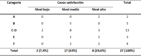 En el centro Isabel Riquelme se observa que el 75% de los funcionarios encuestados de la categoría A refieren un nivel medio de satisfacción, valor que también se evidencia en la categoría C-D. El mayor porcentaje en el nivel alto de satisfacción se encuentra en los profesionales de la categoría B. En general, este centro de salud evidencia positivos niveles de satisfacción laboral, distribuyéndose entre medio y alto (Tabla 4).