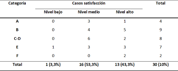 Si el análisis se realiza con toda la muestra (179) se puede decir que las categorías de funcionarios que presentan mayor nivel alto de satisfacción son aquellos de la categoría F con un 60%. La categoría B (enfermeras, psicólogos, nutricionistas, asistentes sociales), la mayoría percibe una satisfacción media, con un 60%. En tanto es la categoría A la que posee un mayor nivel bajo de satisfacción (8,7%) en relación a las otras categorías de funcionarios. Por su parte en el caso de los funcionarios de la categoría C-D el 54% posee un nivel medio de satisfacción. Por último, en los funcionarios de la categoría E el 50% muestra un nivel medio de satisfacción.