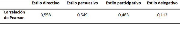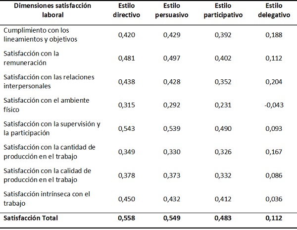En la presente investigación se encontró que el estilo de liderazgo directivo, participativo y persuasivo se correlacionaba positiva y moderadamente con satisfacción laboral total, con un valor de correlación de Pearson 0,558, 0,483 y 0,549 respectivamente, solo la relación entre estilo delegativo y satisfacción fue débil, 0,112. Aun así, no fue nula, lo que indica que siendo distinta de cero alguna incidencia tiene.