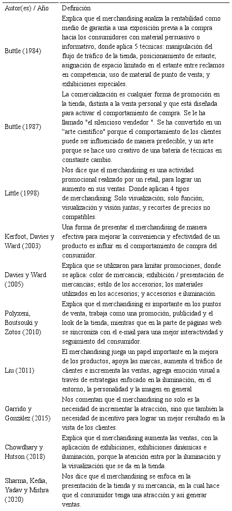 Para comprender mejor los conceptos del merchandising, se muestra una amplia variedad de definiciones de autores que nos explican cómo ha evolucionado su conceptualización a través de los años. En la Tabla 1 se observa que existen diversas definiciones, donde los autores plantean su conceptualización como técnicas en unos casos, otros lo toman como herramientas y también se ven como un complemento para generar experiencia y soporte en el ámbito promocional (Ver Tablas y Figuras al final del documento).