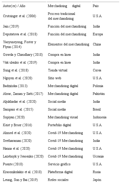 Se consideraron preferentemente artículos científicos entre los años de 2013 y 2020; sin embargo, existen 8 artículos científicos, 7 de ellos expresados en tabla evolutiva de las teorías del merchandising para lograr un mejor entendimiento como definición en sus primeros años y, por último, 1 artículo que es del año 2006 que ayudó a enriquecer la información con respecto al merchandising digital. Por otro lado, los artículos seleccionados debían presentar un enfoque de conceptualización y descripción en cada una de las dimensiones mencionadas para los tres subtemas que aborda el presente artículo.