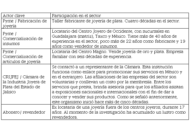 Para realizar el estudio, se consideró como actores clave a los presentados en la Figura 1: (a) las empresas fabricantes de piezas de joyería de la ZMG, donde muchas corresponden a microempresas; (b) la Cámara de Joyería, porque de acuerdo con Parra (citado en Leyva 2018), esta institución lleva 50 años buscando posicionar dentro y fuera del país a las mil empresas afiliadas, además de que, según Parra (citado en “Enamorados aprovechan 14”, 2019), con las acreditaciones que emite su Grupo de Calidad el cliente puede identificar que el quilataje señalado en los productos es real; (c) a los locales de centros joyeros, porque de acuerdo con Cotero (citado en Leyva, 2014), ahí se encuentran productos de calidad a precios competitivos y (d) a los aboneros, quienes trabajan de forma independiente al vender de casa en casa con un muestrario o franela, además de que son una forma importante de venta para el sector (Parra, citado en Romo, 2018). La figura del abonero presenta múltiples matices, porque los que tienen mayor actividad podrían ser considerados empresas (aunque algunas tengan carácter informal), mientras que los que tienen menor actividad expresan autoempleo, incluso precario.