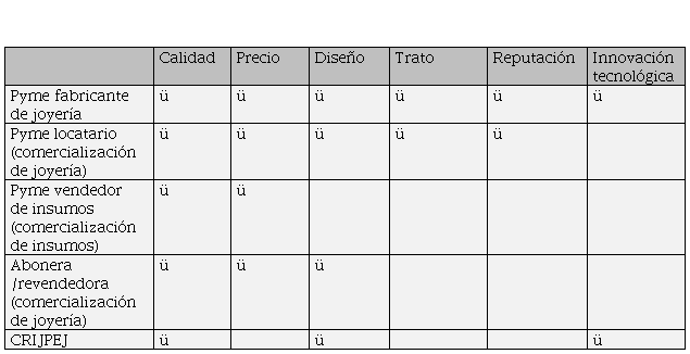 Otro cuestionamiento a los participantes fue acerca de las figuras que consideraban más sobresalientes del sector. Las respuestas de los entrevistados señalaron en forma unánime a la Cámara, a los centros joyeros, los talleres, los aboneros y compradores; respuestas que coinciden con lo señalado en la literatura, ilustrado en la Figura 1. De esto se deriva que afiliarse a la Cámara o estar dentro de los centros joyeros, las alianzas o colaboraciones son un factor crítico, y aunque no se señala de esta forma, se sugiere investigar con mayor profundidad estos fenómenos. De igual forma, la pyme comercializadora de insumos expresó que, para ingresar en este medio, la falta de conocimiento del funcionamiento de la industria es un obstáculo importante. Esto significa que, para participar en el sector, carecer de know-how es una barrera de entrada.